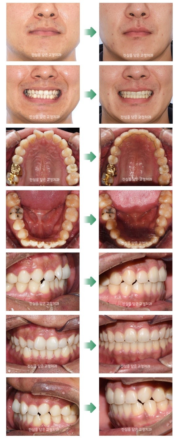 치료 결과를 유지하기 위해 위아래 앞니 뒤쪽에 고정식 유지 장치를 부착하였으며, 가설성 유지 장치 사용도 병행하였습니다. 이어 전후 사진 비교해 보도록 하겠습니다.