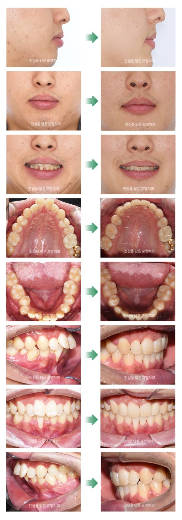교정치료 결과, 심하게 삐뚤어져 있던 치아들이 가지런하게 배열되었습니다. 뻐드러졌던 위 앞니 각도가 개선되었으며 불룩하고 뒤집어진 양상을 보이던 아랫입술의 라인도 양호하게 개선되었습니다. 교정치료 전 화가 난 듯한 그리고 퉁명스러워 보이는 인상이 아주 자연스러워졌습니다.
