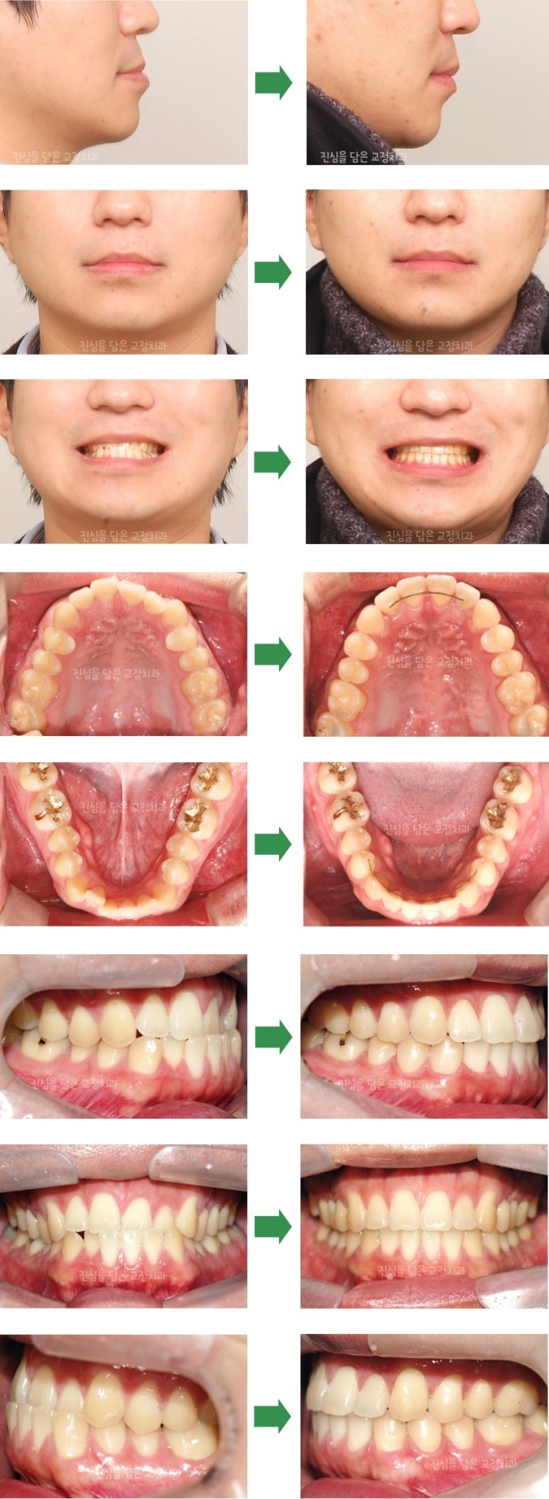 눈으로 볼 수 있는 앞니 부분뿐만 아니라 보이지 않는 어금니의 교합까지 잘 맞게 되었습니다. 위 앞니의 잇몸라인도 좌우 비대칭이었으나 자연스럽게 대칭으로 개선되었습니다. 아래 입술의 위치가 개선되어 주걱턱 같았던 옆모습이 자연스러워졌습니다.