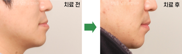 비수술 교정을 위해 내원하셨기 때문에 수술을 동반하지 않았습니다. 때문에 아래턱뼈의 길이는 바뀌지 않았습니다. 그러나 앞니가 똑바로 물리게 되면서 위아래 입술에서 아래턱 끝까지 라인이 보다 자연스러워졌습니다.