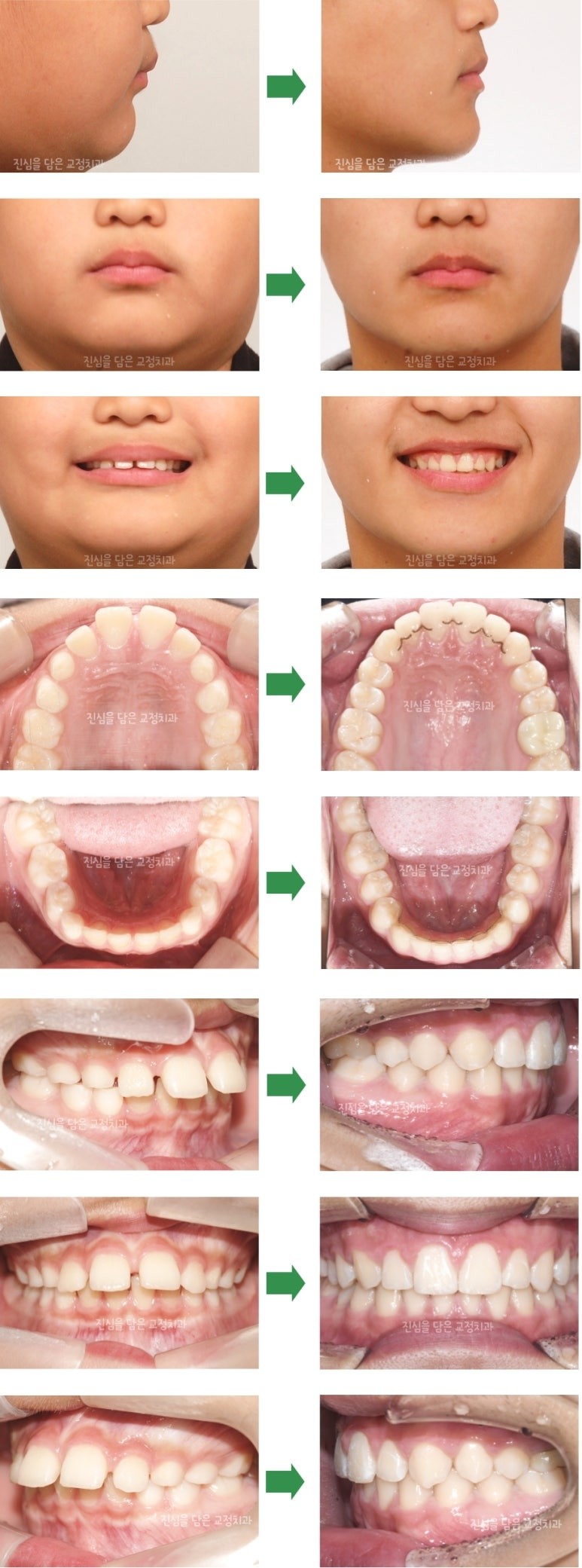 처음 내원 당시 치아 배열이 나쁘지 않은 상태였습니다. 따라서 2차 교정치료 기간이 다른 앵글씨 2급 부정교합 환자분에 비해 일찍 치료가 마무리 되었습니다. 환자분께서는 장치 협조도도 매우 좋았습니다. 덕분에 골격적으로 좋은 반응을 얻을 수 있었습니다. 뻐드러진 위 앞니 각도 및 벌어진 치열의 개선을 통해 심미적인 부분과 치아와 얼굴 모습의 변화를 통해 심리적으로도 긍정적인 효과를 얻을 수 있었습니다.